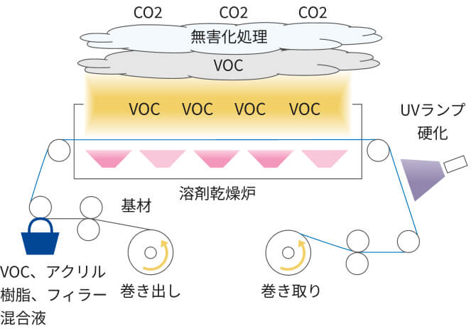 VOCで配合したフィラービーズ入りのアクリル樹脂を塗工し、乾燥させます。トルエンなどのVOCは有害なため、無害化処理(燃焼)させますが、その処理によりCO2が発生します。